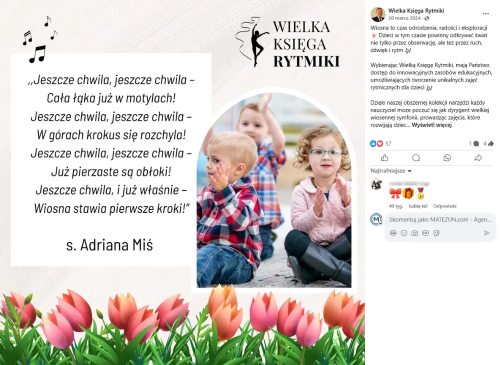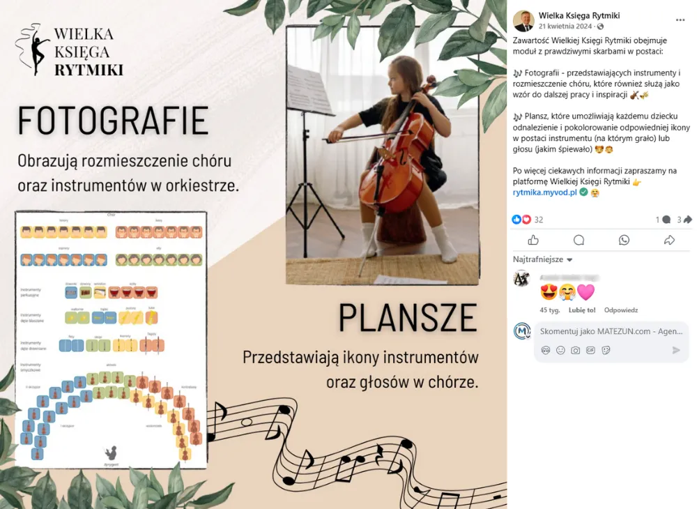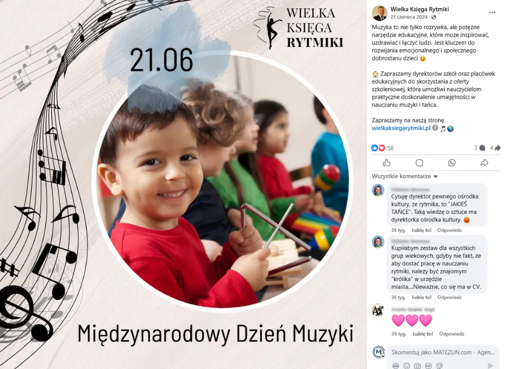 Profil firmy zajmującej się edukacją muzyczną. Skierowany do nauczycieli przedszkoli, szkół, instruktorów domów kultury, wykładowców oraz studentów. Oferuje narzędzie wspierające w prowadzeniu zajęć z rytmiki. Na profilach social media regularnie publikujemy treści związane z edukacją muzyczną, rytmiką, w tym ciekawostki, materiały dydaktyczne, animacje i filmiki z zajęć.
