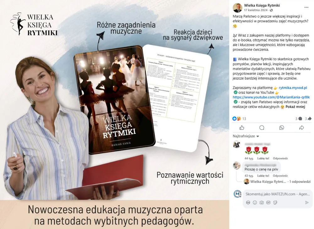 Efektywne dotarcie do specyficznej grupy docelowej poprzez regularne publikowanie praktycznych materiałów edukacyjnych, animacji oraz nagrań z zajęć, dostosowanych do potrzeb nauczycieli.